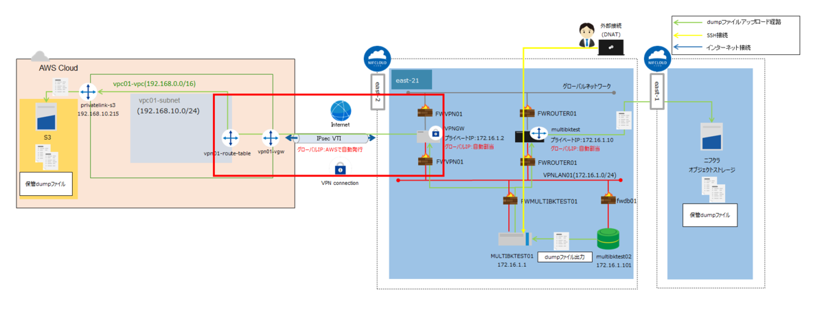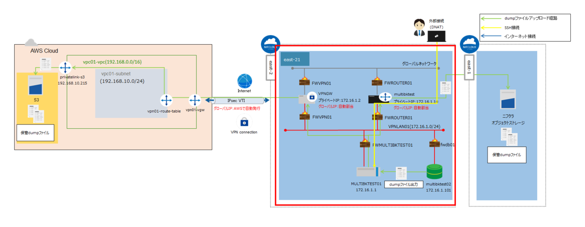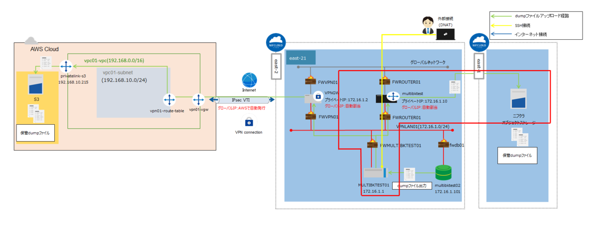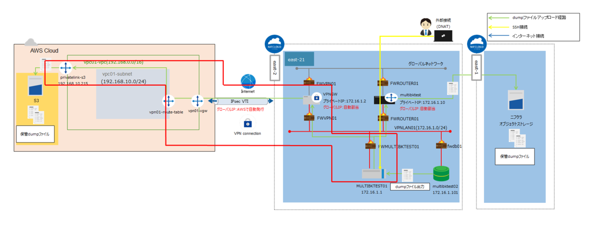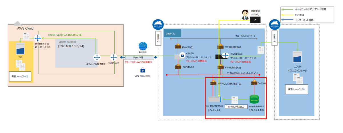 今回マルチクラウド環境を構築して、ニフクラオブジェクトストレージサービスにはニフクラルーターのNAT機能で、Amazon S3にはAWS PrivateLink for Amazon S3でアクセスしてバックアップファイルをアップロードするマルチクラウドバックアップの方法をご紹介します。