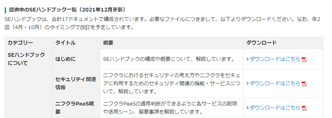 その中で、SEハンドブックは、ニフクラでシステムを構築する方向けに構築時のポイントを解説したハンドブックです。SEハンドブックは以下のような特性があります。