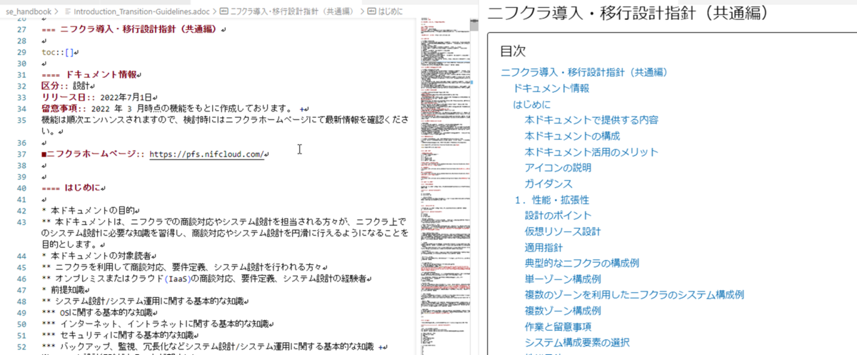 このツールも、困った特性があり、参照していた画像が無視されてしました。 - 出来上がったasciidocファイルを各自の地道な作業とツールを駆使して、元のSEハンドブックと同じように仕立てる