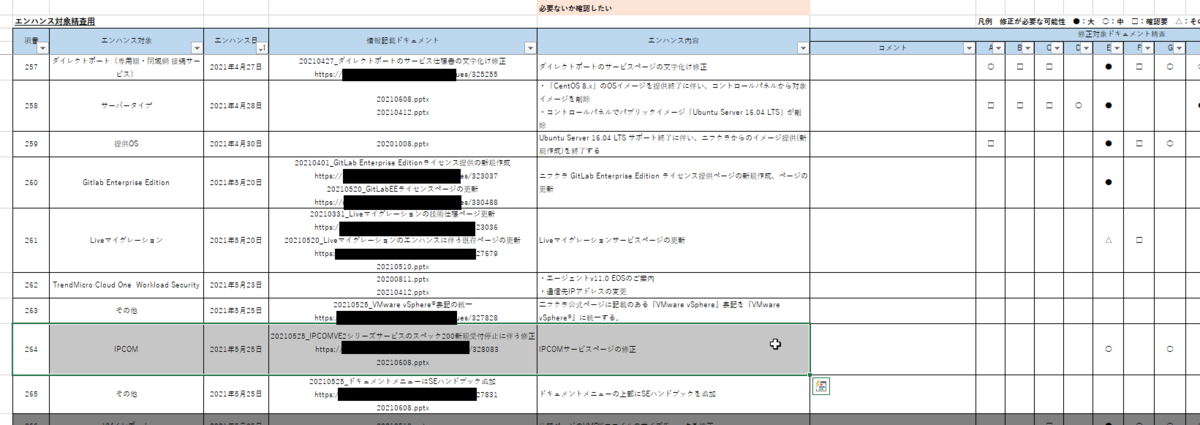 - エンハンス情報をエクセルシートに一覧化しているのですが、エンハンス内容へのリンク集となってしまっており、実際の修正内容は別途確認する必要がありました。また、修正予定内容のレビューができていませんでした。