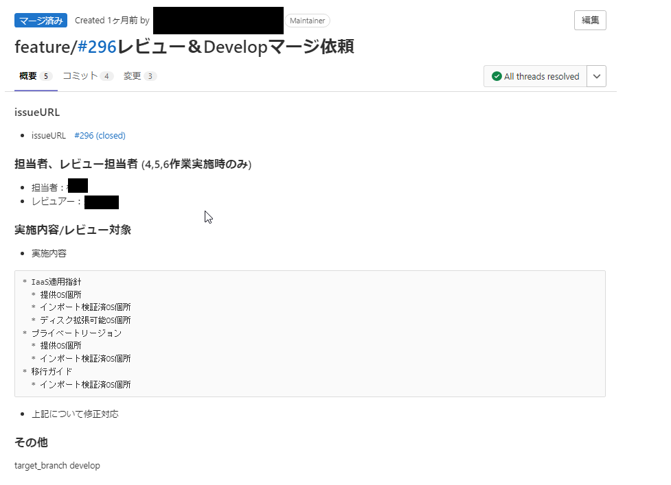 - 修正完了次第、マージリクエストにてレビュー依頼を出す