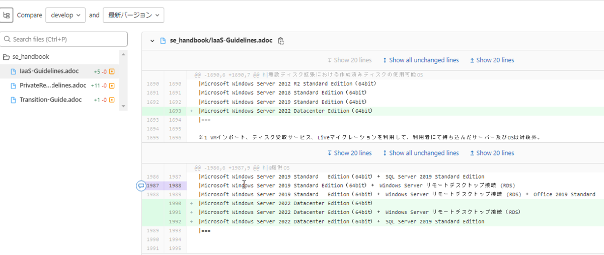 ドキュメントレビューを、レビュー用ブランチへのマージリクエストとして運用することで、修正前後の差分確認、修正内容の確認が容易となりました。(問題B-②~④の改善)