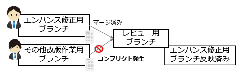 また、並行して実施している修正について、マージ漏れなどが発生し、記載内容がデグレードすることもありました。