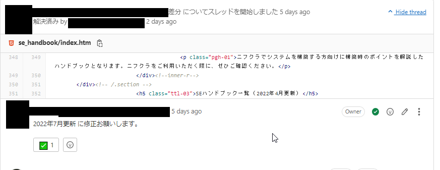 - 修正について進捗状況の確認ができず、また、どのエンハンス内容に紐付いたSEハンドブックの修正レビューなのかがわかりませんでした。