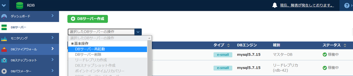 3.1. リードレプリカを1台選択し、メニューより「DBサーバー再起動」を選択します。