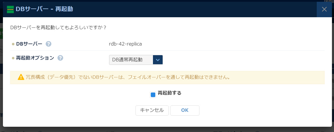 再起動オプションで「DB通常再起動」を選択し、OKボタンを押します。