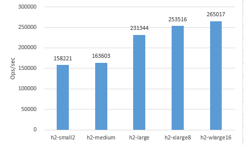 - h2-small2とh2-wlarge16の比較で、CPUコア数は1から8に増えているが処理性能は167%程度に留まっている。