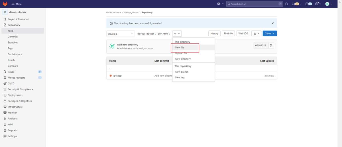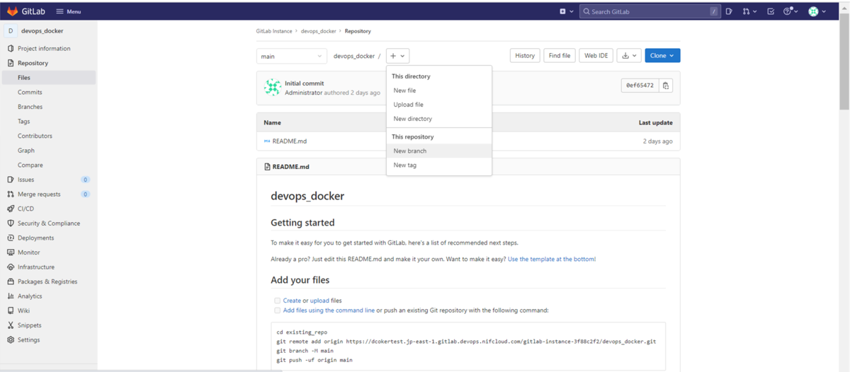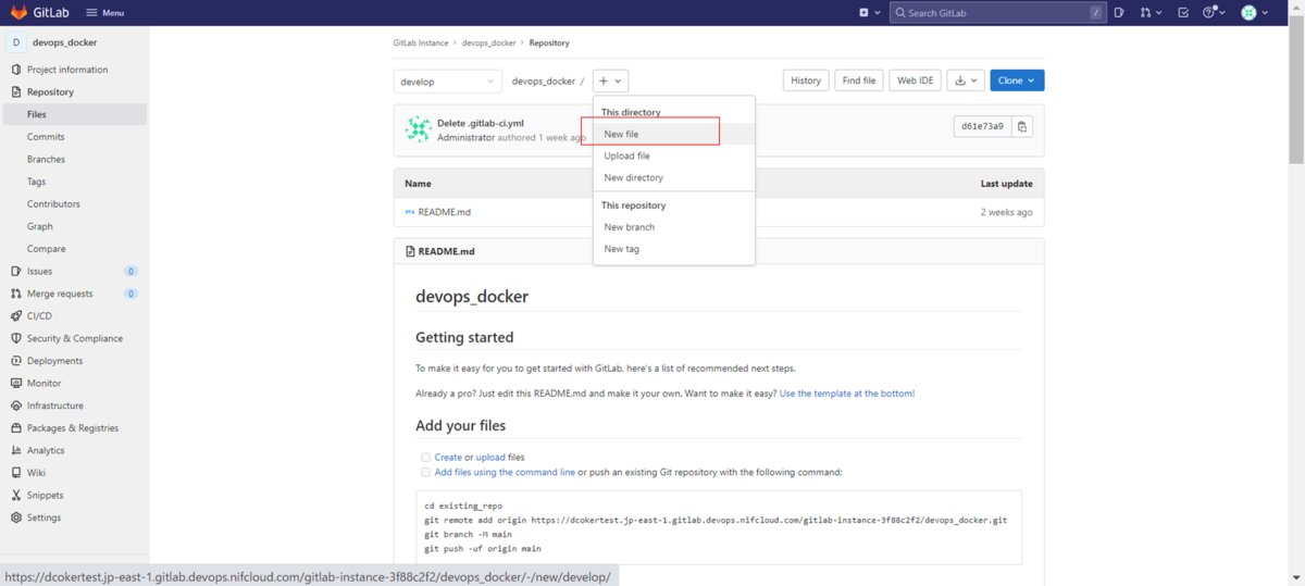 ※このタイミングではGitLabRunnerのジョブを定義する.gitlab-ci.ymlが存在しないのでGitLabRunnerのジョブ、CI/CDパイプラインは実行されません。