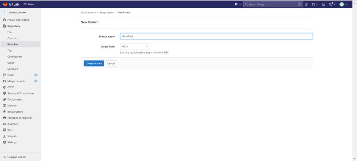 「Branch name」に「develop」と入力します。「Create branch」ボタンをクリックします。