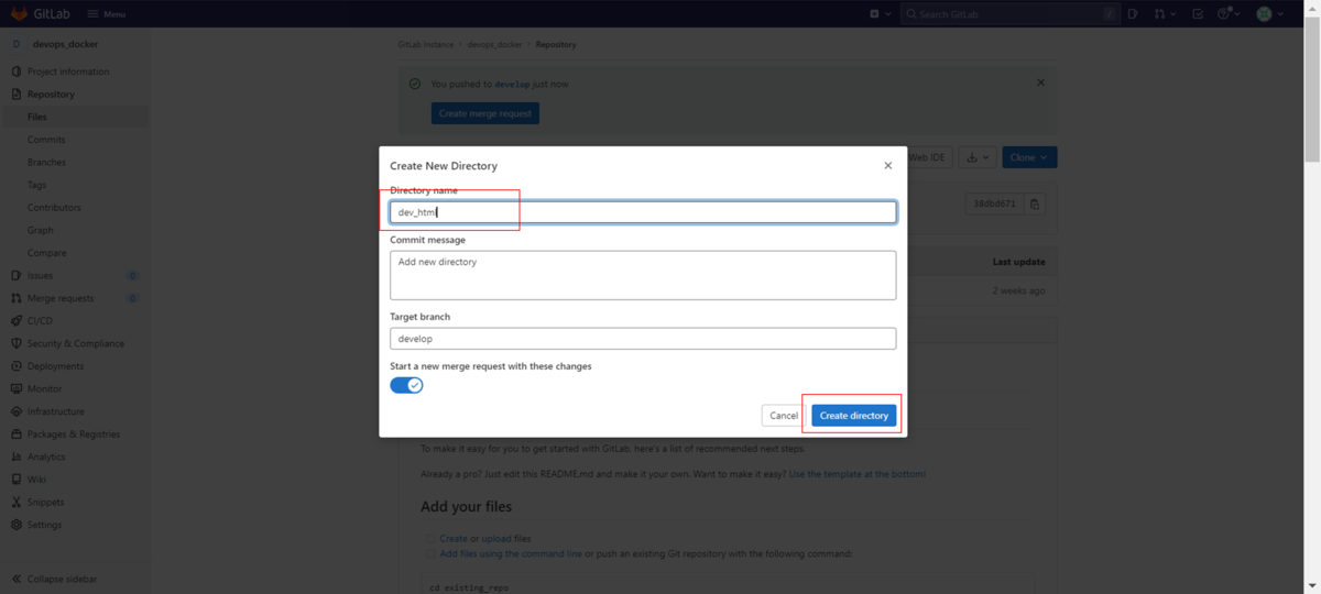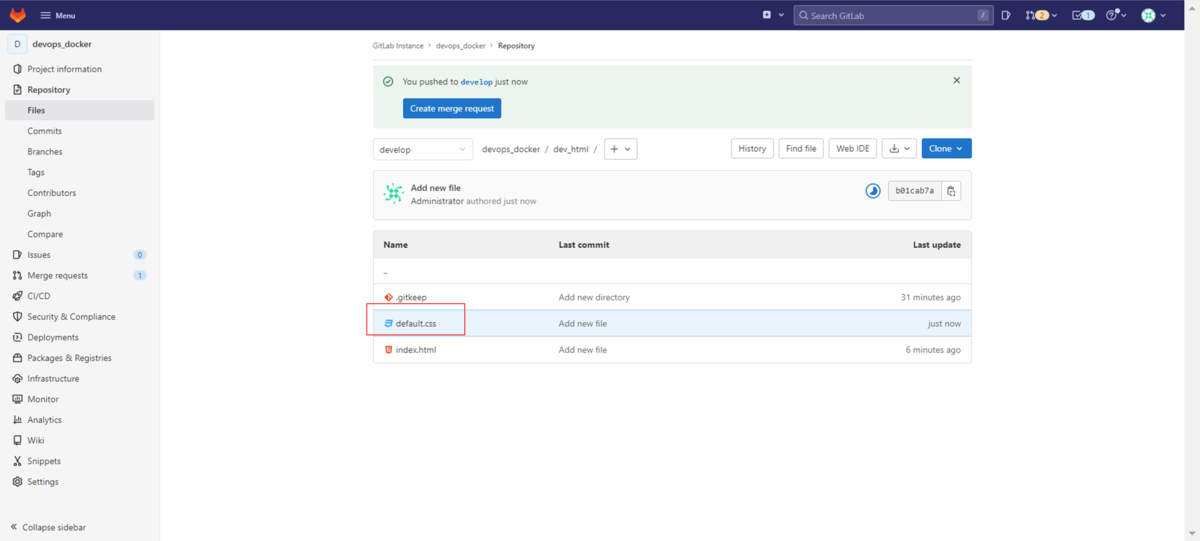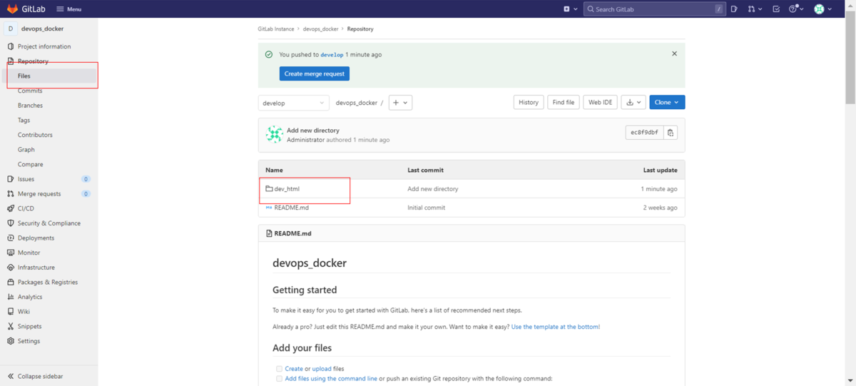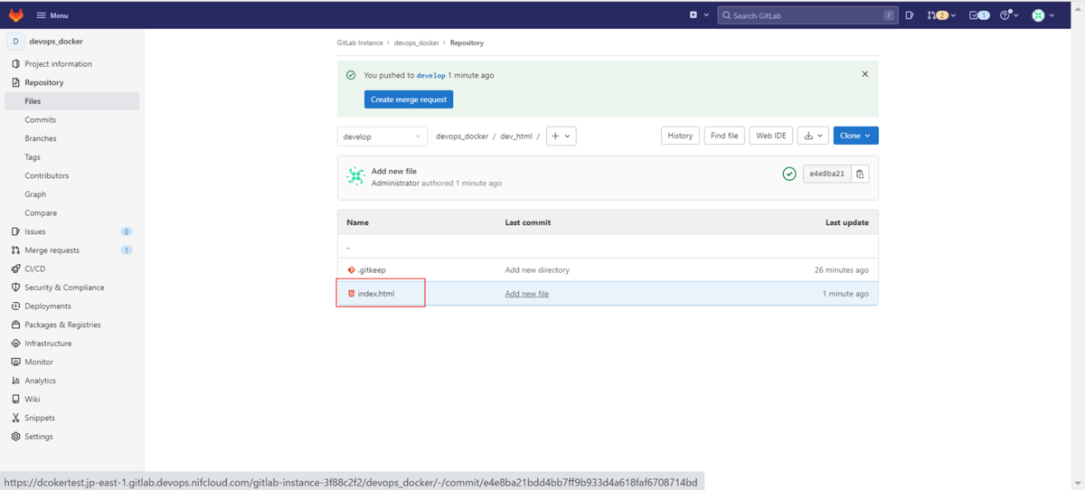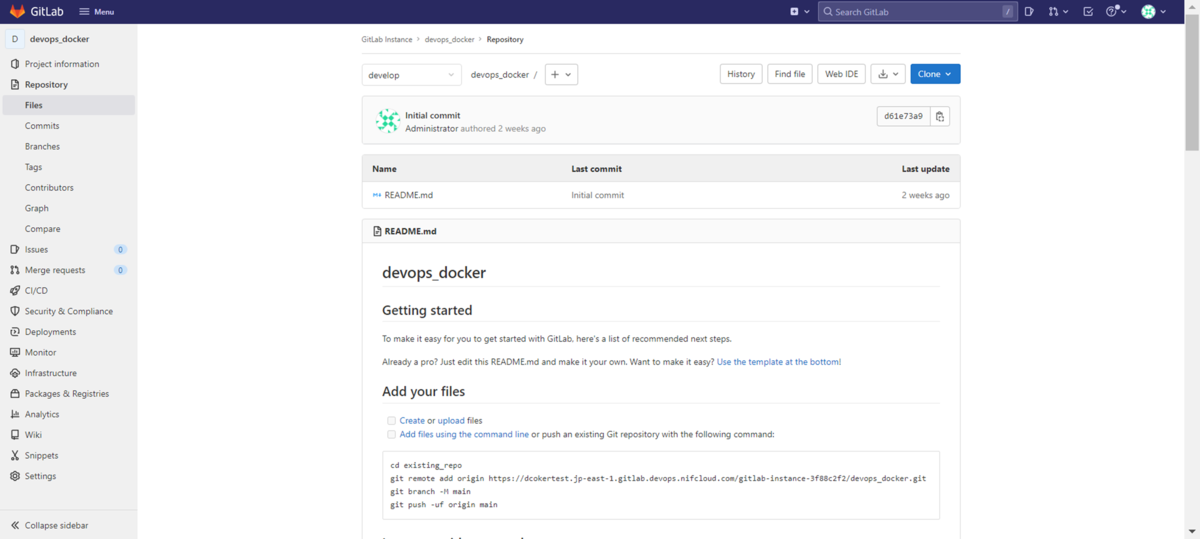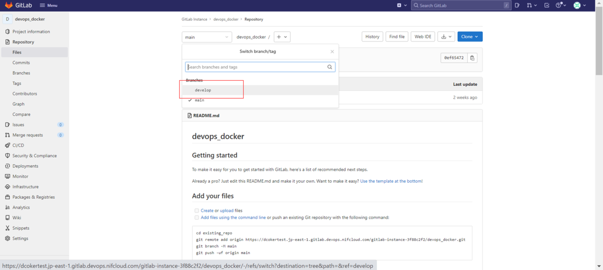 「Repository」→「Files」で「develop」ブランチが表示されます。
