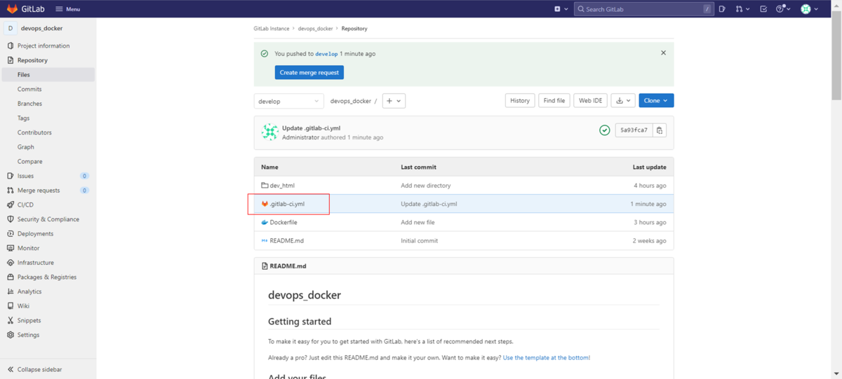 ①. DockerfileとGitLabRunnerのジョブ実行内容を定義する.gitlab-ci.ymlファイルをgitリポジトリ(developブランチ)に配置します。GitLabサーバーがリポジトリ更新を検知します。