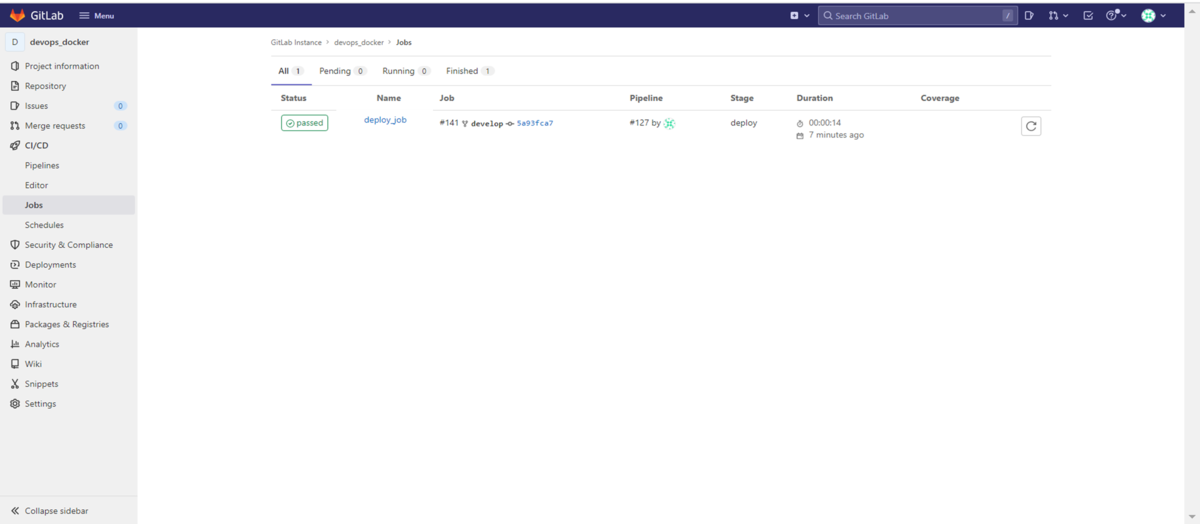 「CI/CD」→「Jobs」を確認するとGitLabRunnerがジョブを実行していることが確認できます。