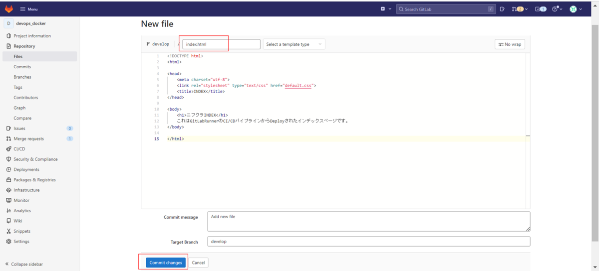 「Commit changes」ボタンをクリックするとindex.htmlが作成されます。