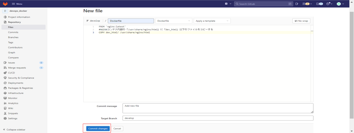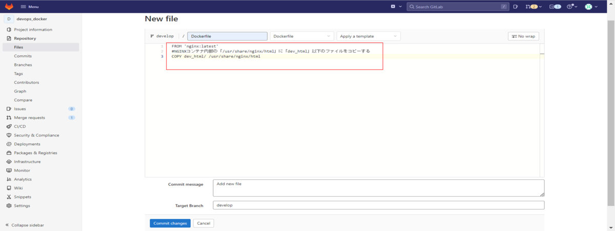 リポジトリに戻ると「Dockerfile」が作成されています。