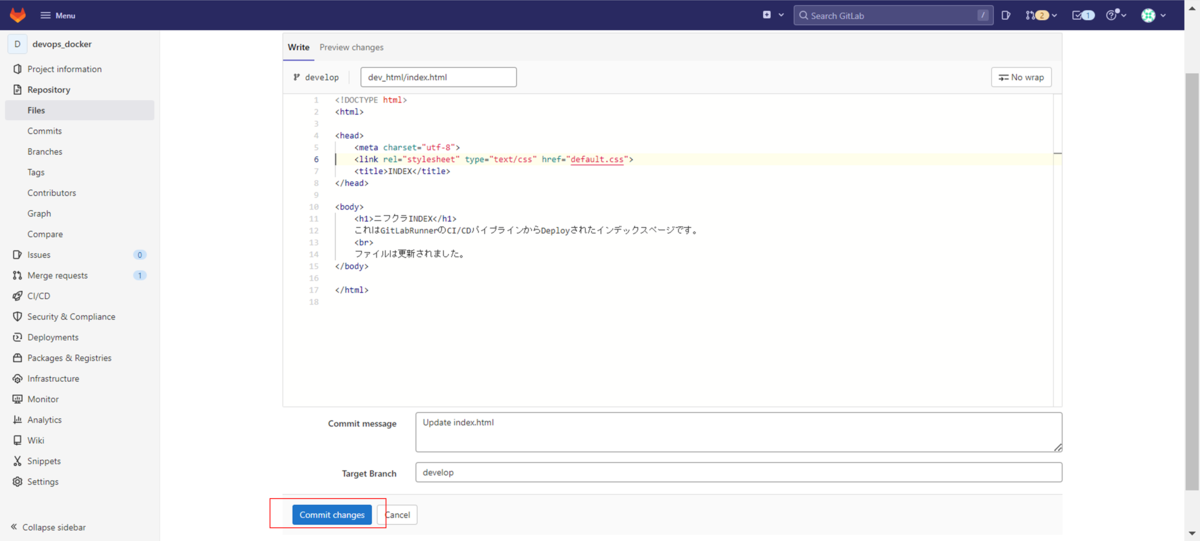 検証2では「index.html」ファイルを更新してCI/CD環境で以下の内容が実行されることを確認します。