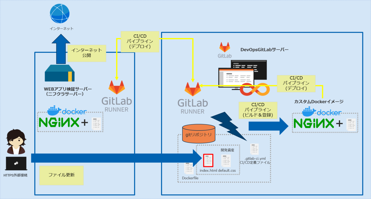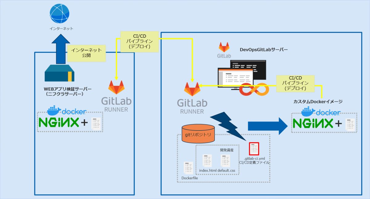 GitLabRunnerのCI/CDパイプラインの処理でdocker pullコマンド、docker runコマンドを実行してWEBアプリ検証サーバーにWEBアプリをデプロイします。