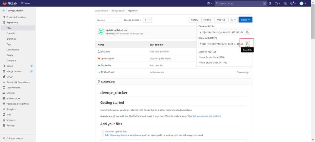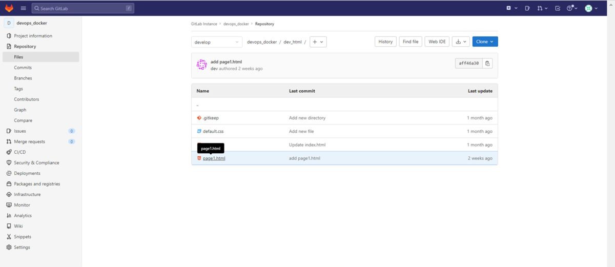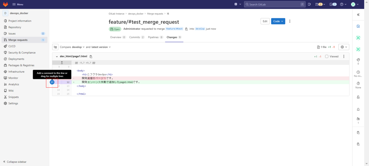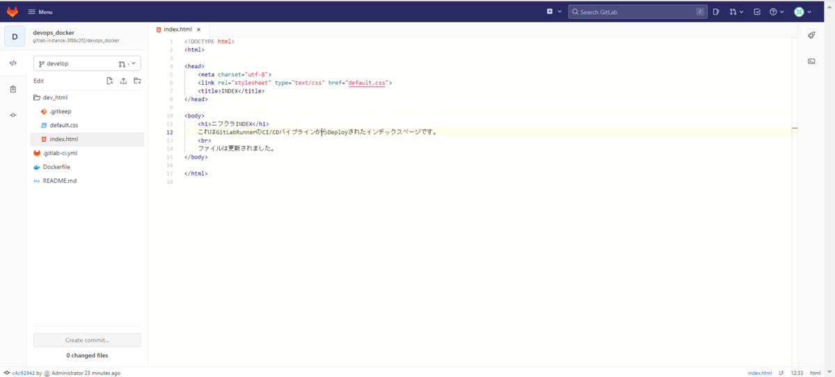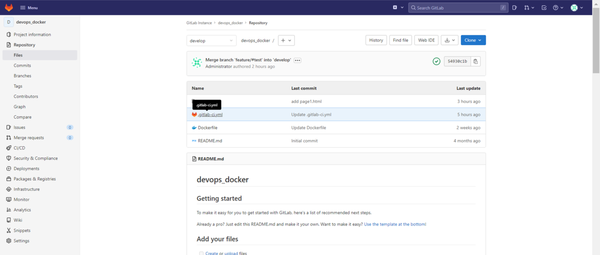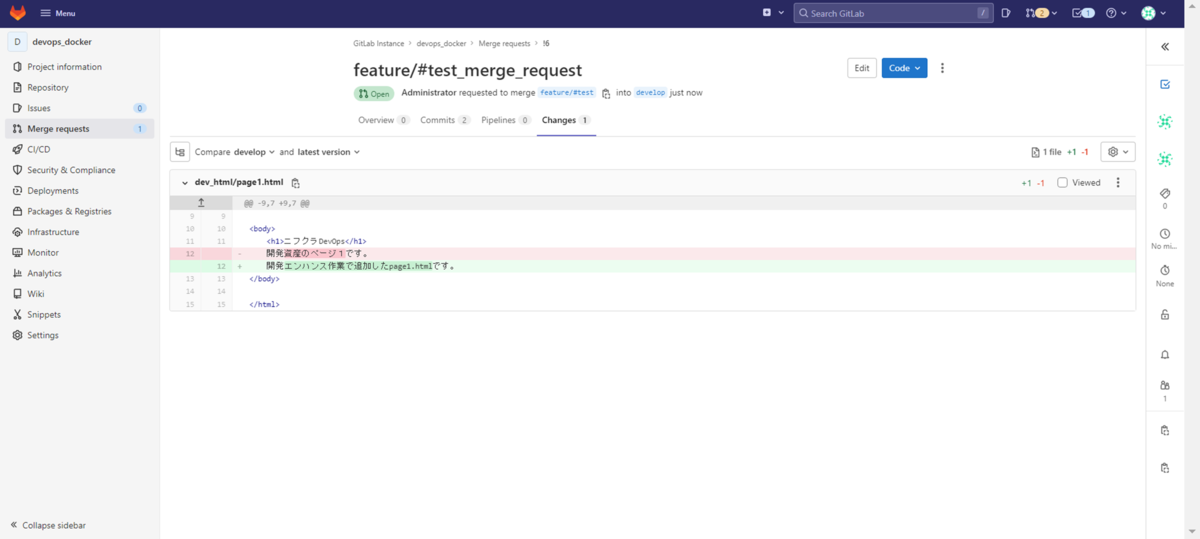 DevOps with GitLabサーバーのdevelopブランチの内容がマージされて更新されていることが確認できます。