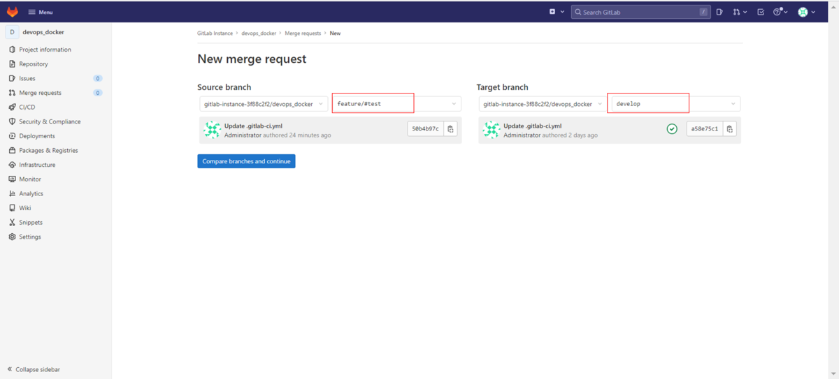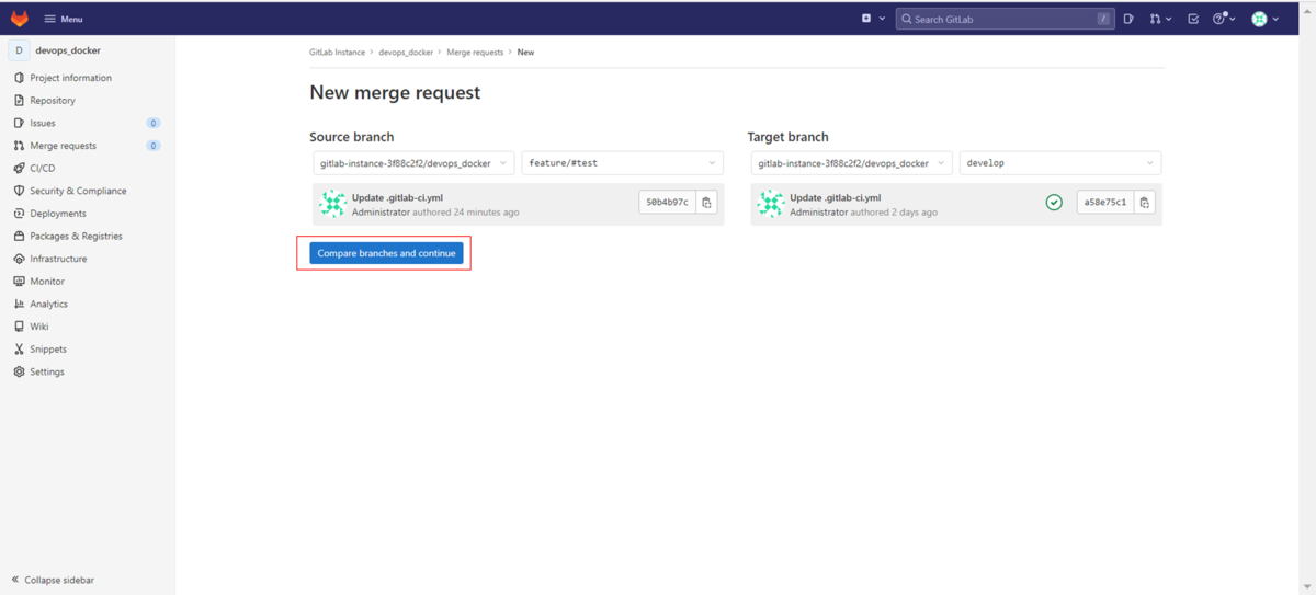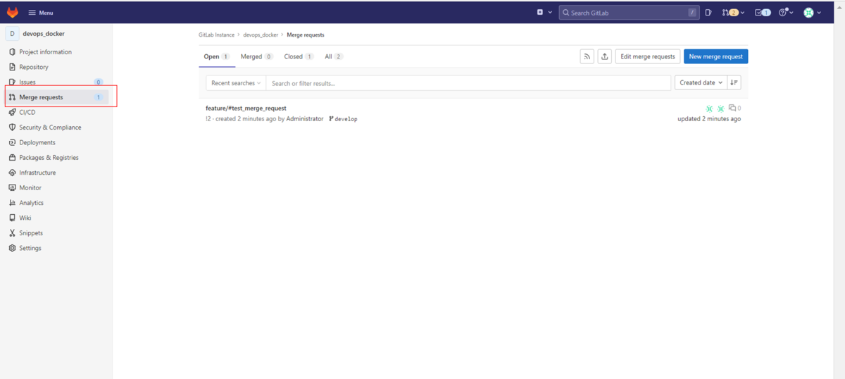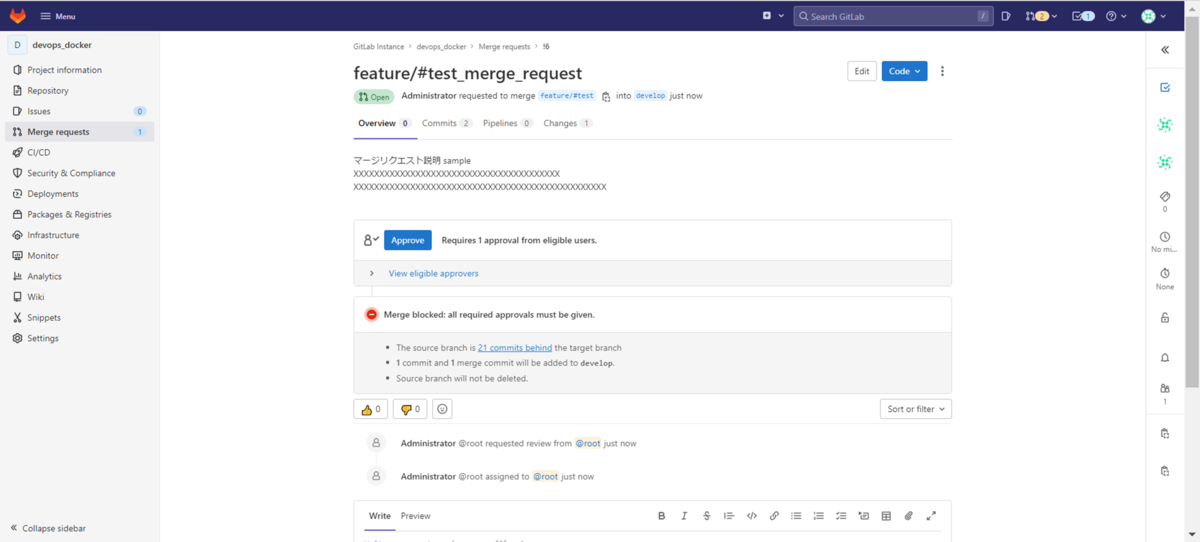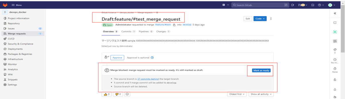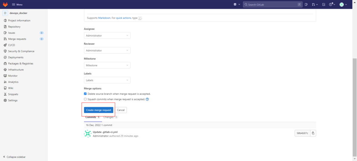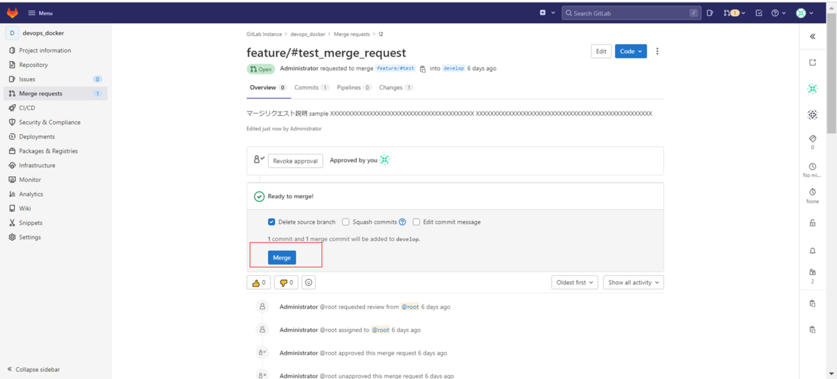 「Create merge request」ボタンをクリックしてマージリクエストを作成します。