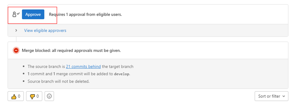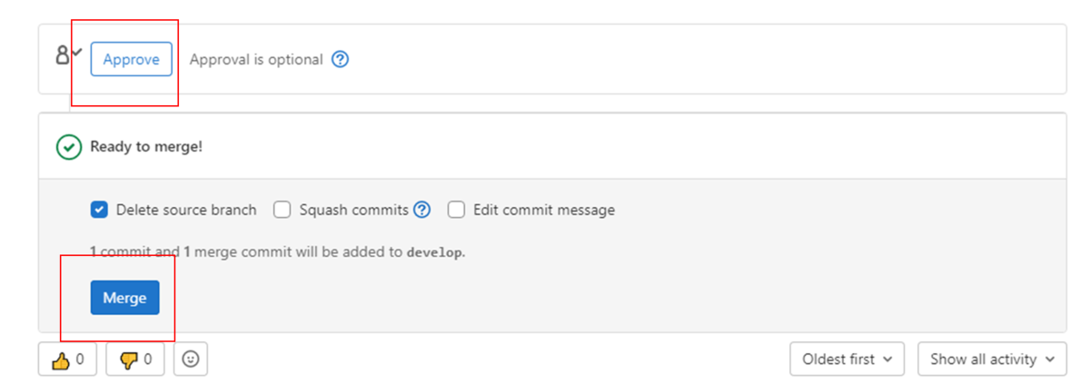 更新内容のレビューが完了したらマージリクエストの「Approve」ボタンをクリックしてマージを承認します。