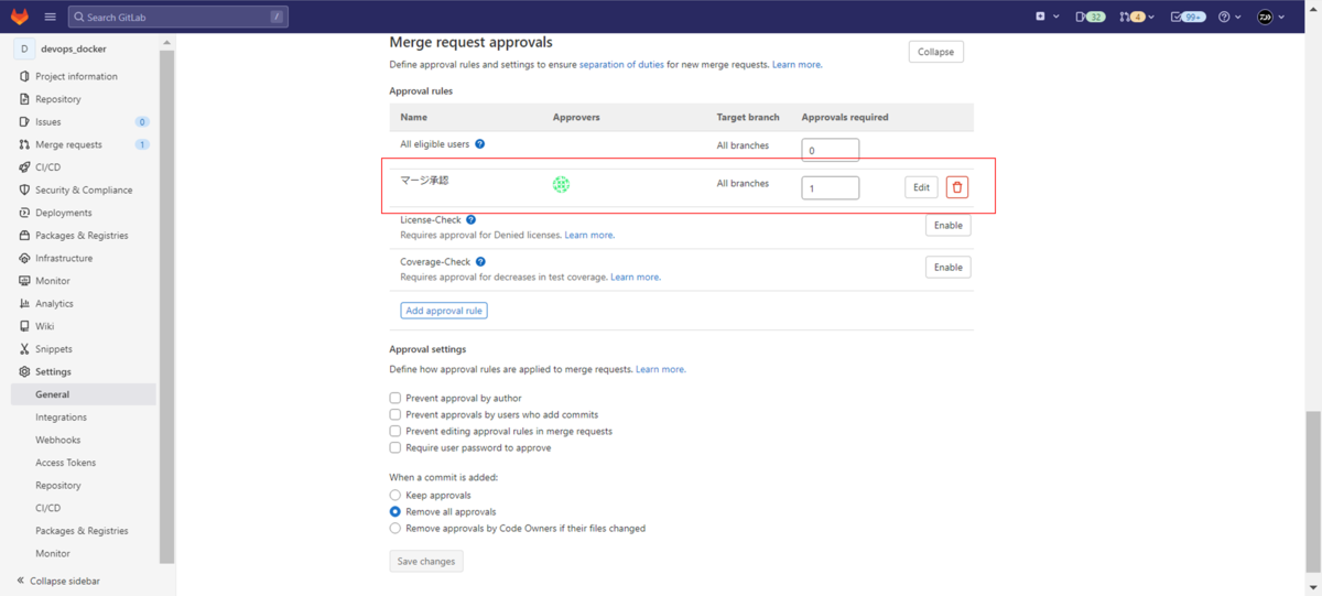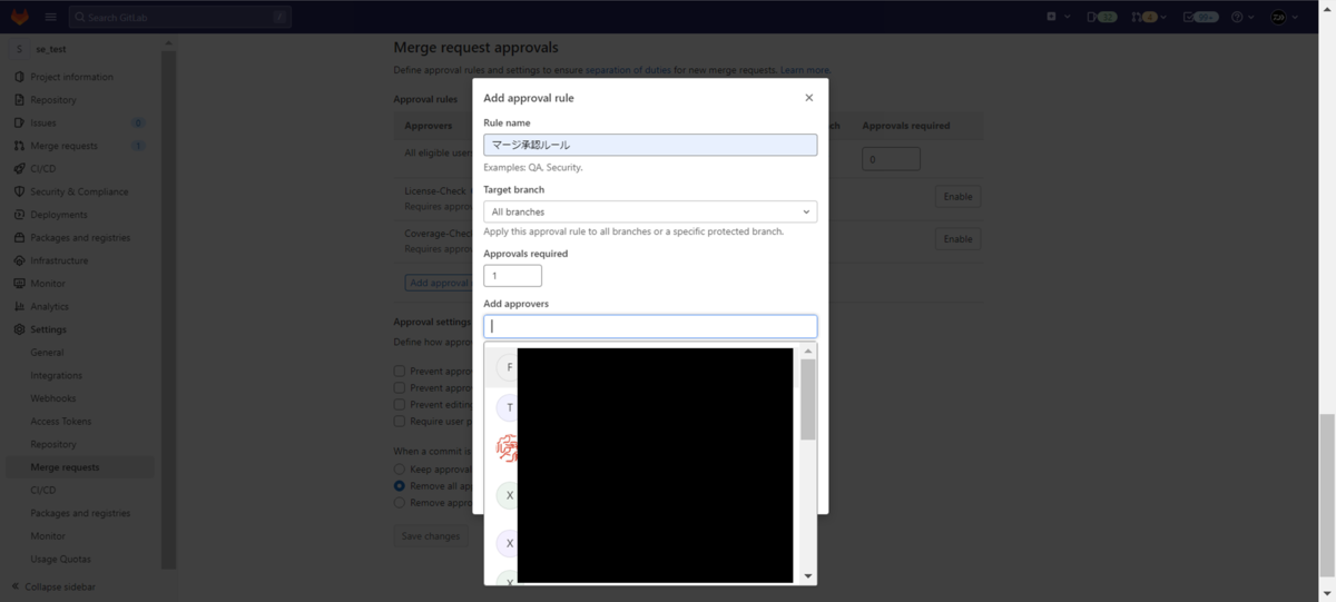 検証ではマージ承認ルールを設定してマージ実行を制御しました。