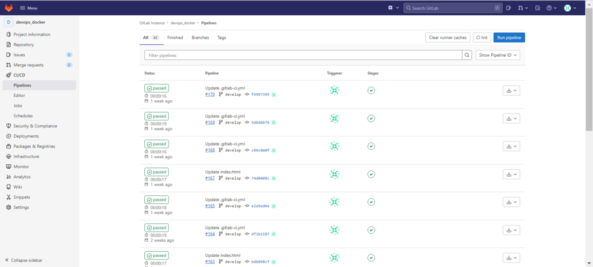 「CI/CD」→「Jobs」を確認するとCI/CDパイプラインが実行されていることが確認できます。