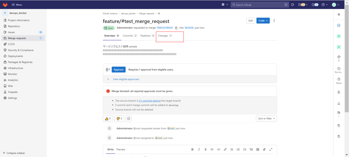 マージリクエストの承認前に更新資産をレビューするために発行したマージリクエストの「Changes」タグをクリックします。