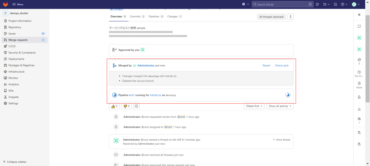 マージリクエスト承認&マージ実行は完了です。
