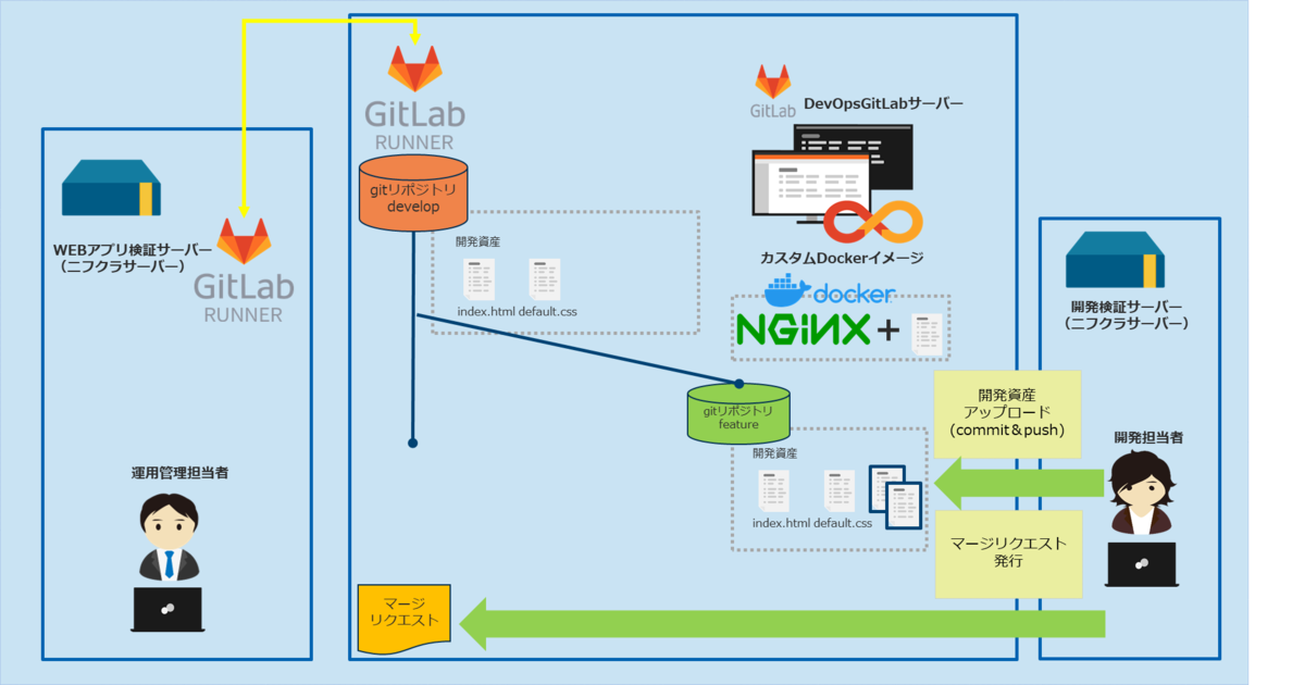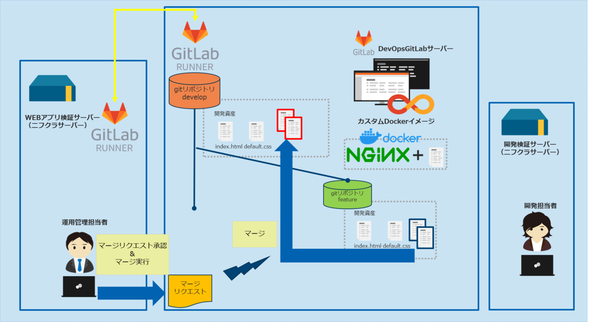 以下④~⑦にて、運用管理者のマージリクエスト承認~承認後の自動化されたCI/CDパイプライン実行からWEBアプリ検証サーバーへのデプロイ工程を検証&解説します。