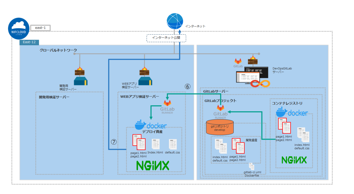 ⑥~➆. WEBアプリ検証サーバーに自動デプロイされたWEBアプリがインターネットに公開されます。