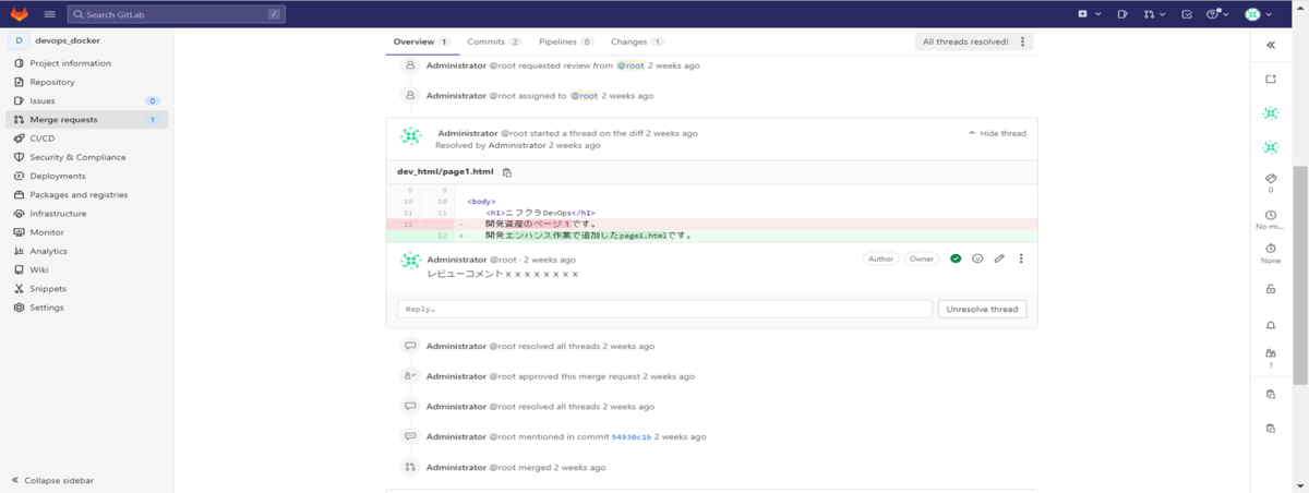 GitLabのマージリクエスト機能は上記2~5の工程を簡易な操作と視覚的に管理ができる有用な機能です。また前回作成したCI/CDの設定と連携させることができるので、スピーディに自動デプロイが実施できます。