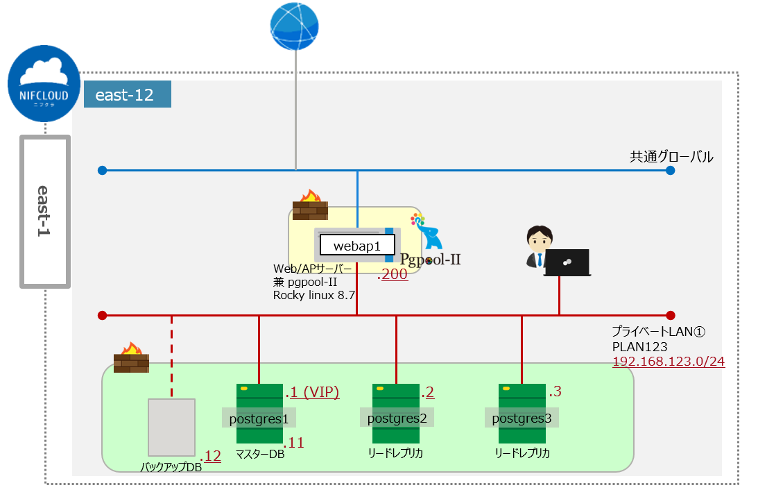 | webap1 | Web/AP兼pgpoolサーバー | Rocky Linux 8.7 | pgpool | 192.168.123.200/24 |
