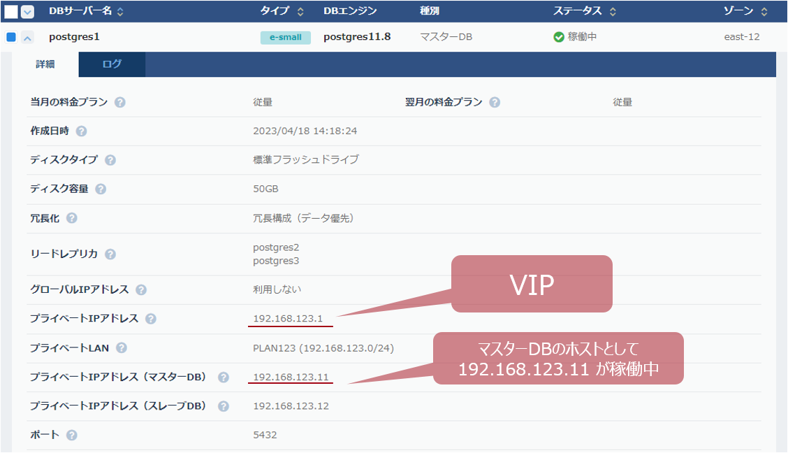 - IPアドレス:192.168.123.11 がマスターDBとしてVIPと紐づいて動作しています。
