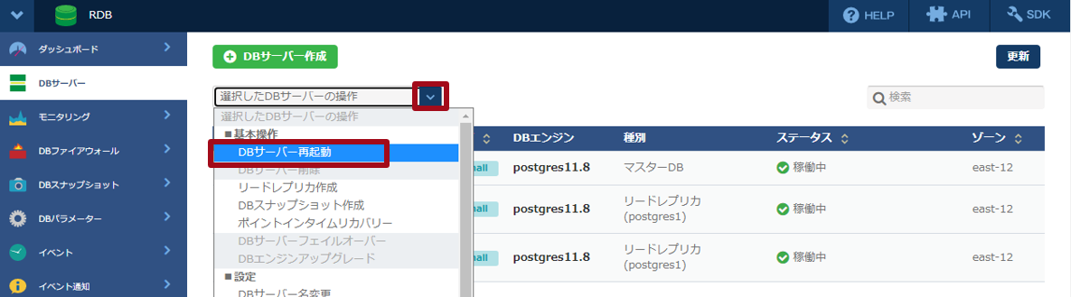 - 「選択したDBサーバーの操作」より、「DBサーバー再起動」 を選択