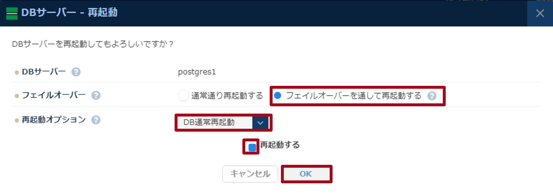 - 「フェイルオーバーを通して再起動する」 → 「DB通常再起動」 → 「再起動する」 をそれぞれ選択し、「OK」で再起動を実施