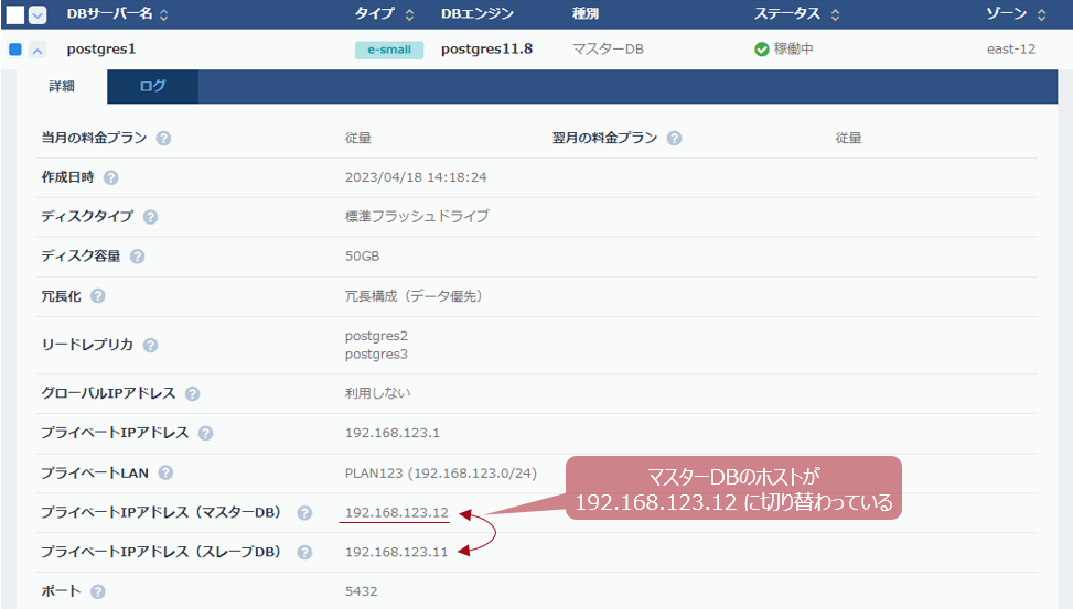 - フェイルオーバー動作により、IPアドレス:192.168.123.12 がマスターDBとしてVIPと紐づいていることが確認できます。