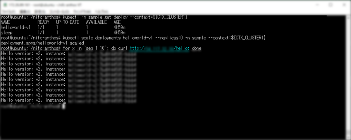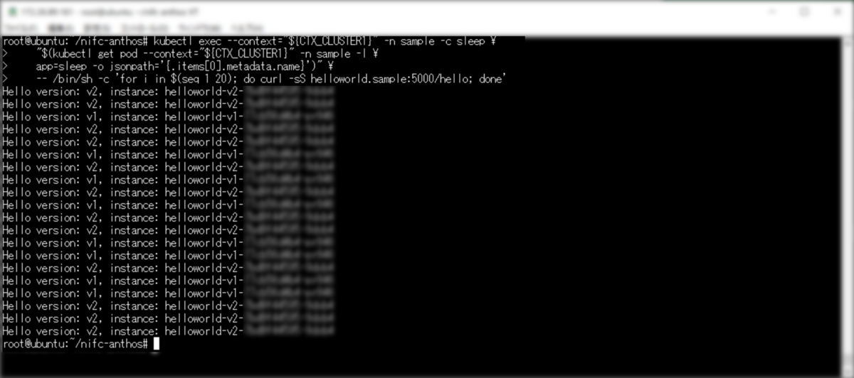 ①. マルチクラスタメッシュのロードバランシングが稼働してニフクラとGoogleCloudのKubernetesクラスタ間で負荷分散されているかを確認します。