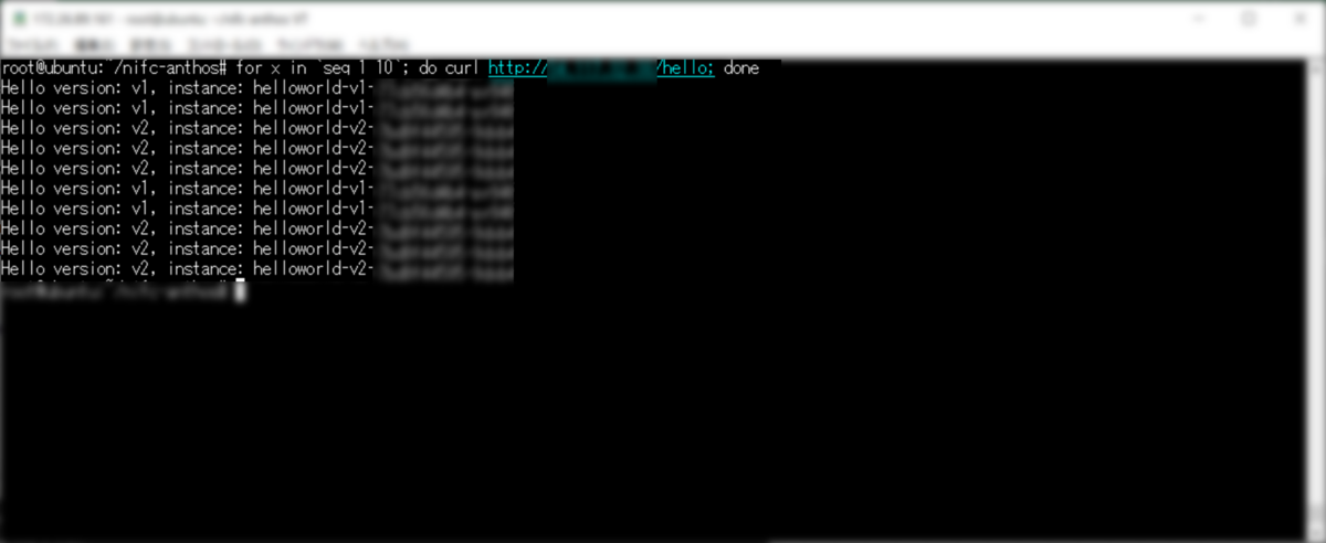 v1(ニフクラ環境)とv2(GoogleCloud環境)が出力されて両方にアクセスしていることが確認できます。ネットワーク間で分散アクセスしていることが確認できます。