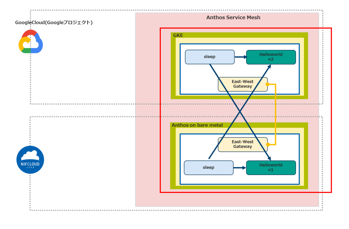マルチクラスタメッシュになっているニフクラとGoogleCloud間の疎通確認を実施します。