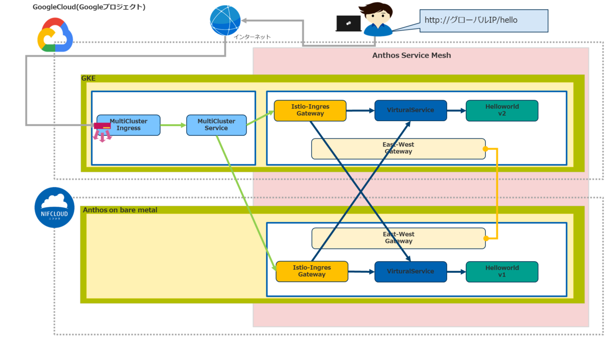 ②. マルチクラスタメッシュの環境にインターネットからアクセスするために外部ロードバランサーとしてMultiClusterIngress・MultiClusterService(他社サイトリンク)をGoogleCloud環境に作成してGoogleCloudのKubernetesクラスタ間で負荷分散されているかを確認します。