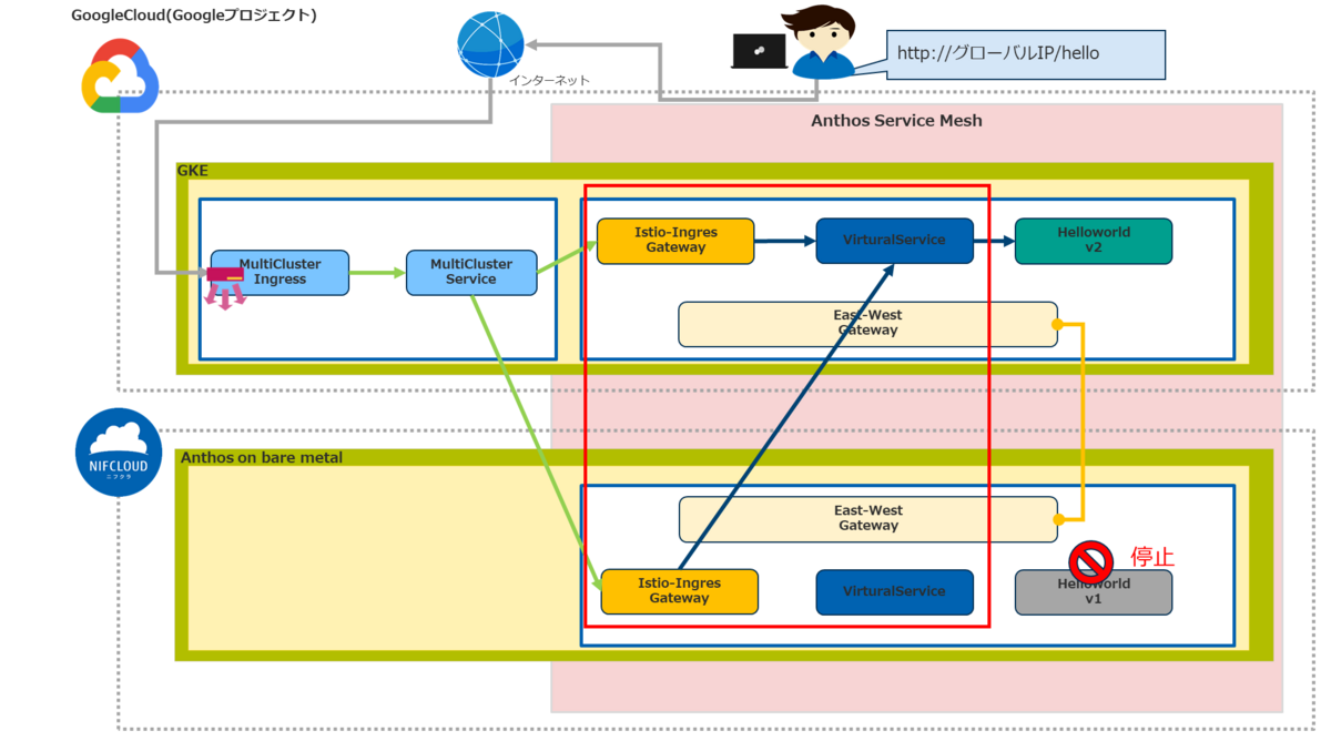 ニフクラ環境のAnthosクラスタが停止した場合、GoogleCloud環境のGKEクラスタが稼働してサービスが継続することを確認します。