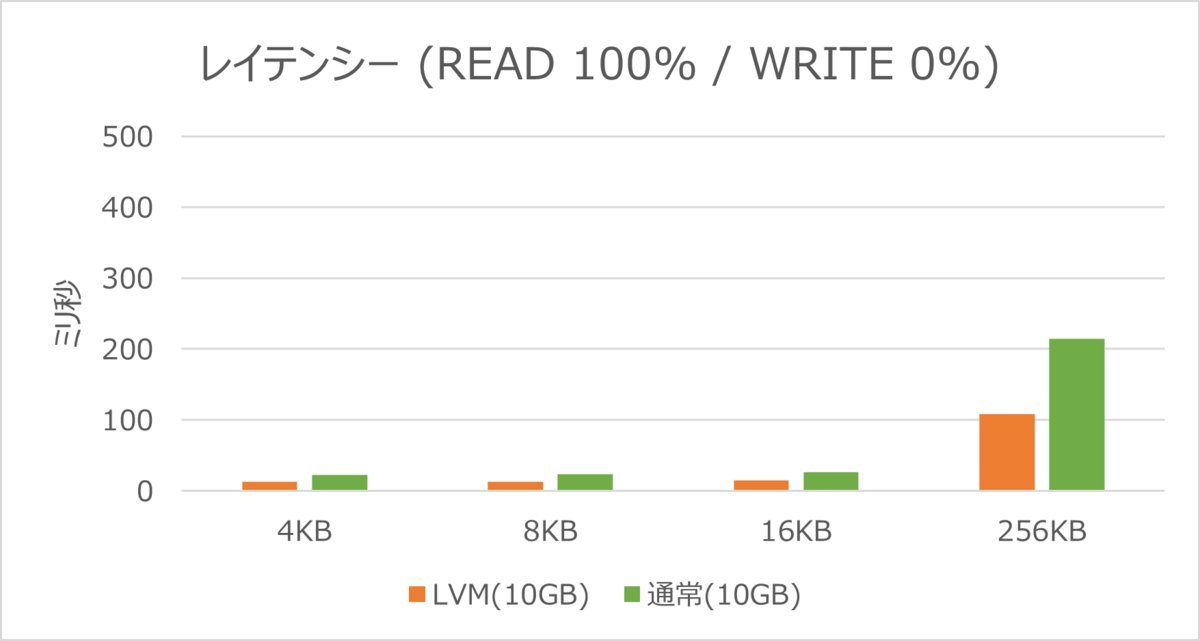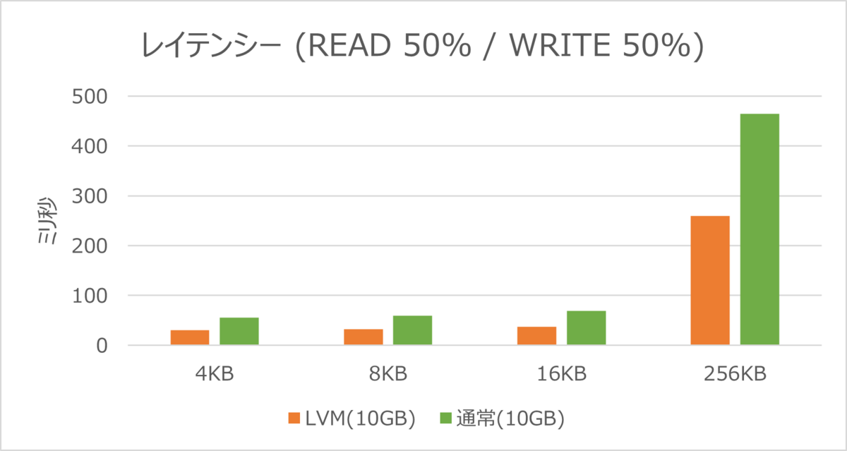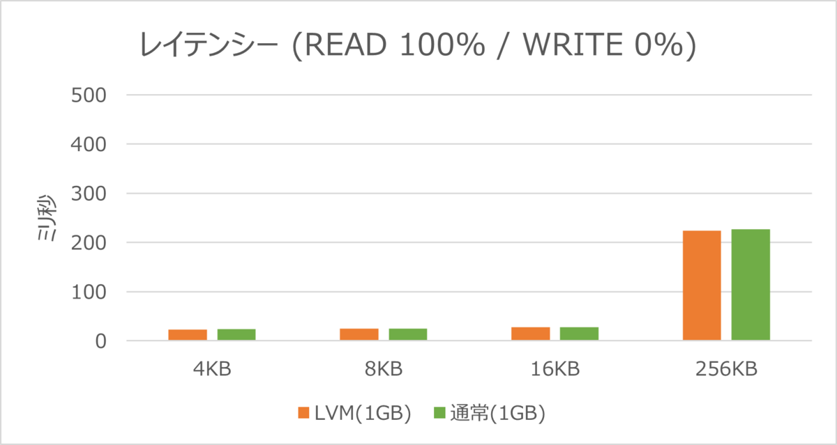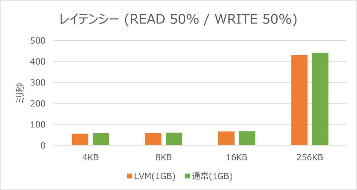 レイテンシーでは、LVM構成のディスクと通常のディスクでほとんど差がみられない結果となりました。
