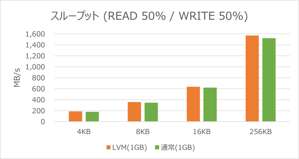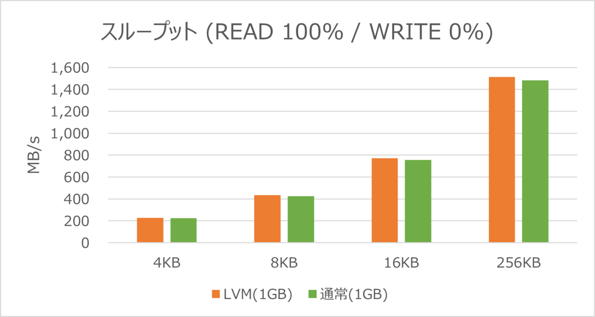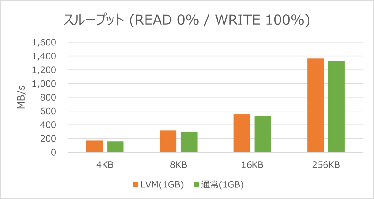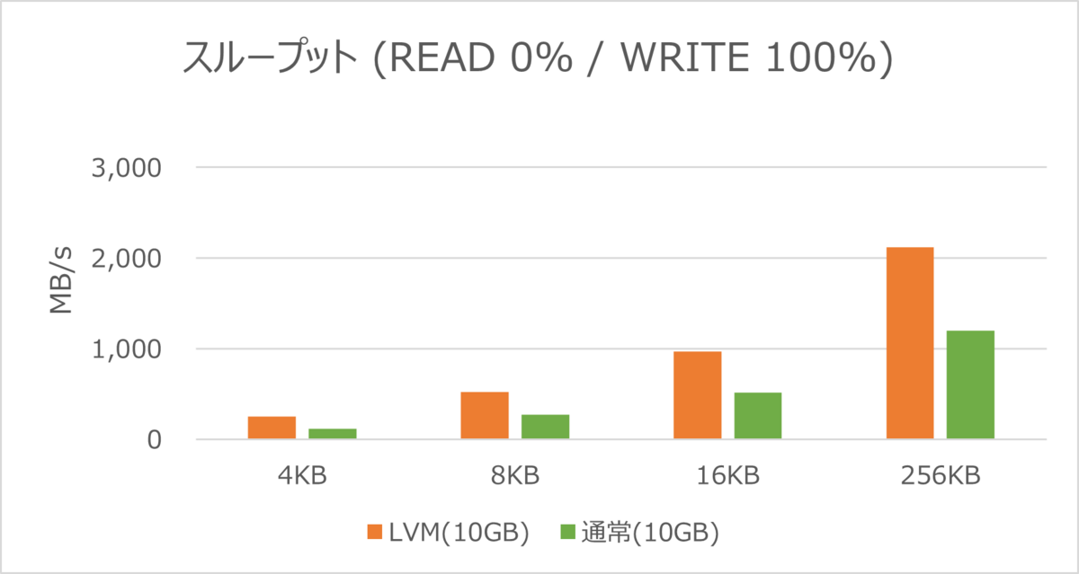 スループットでも、LVM構成の論理ボリュームの方が数値が高い結果となりました。