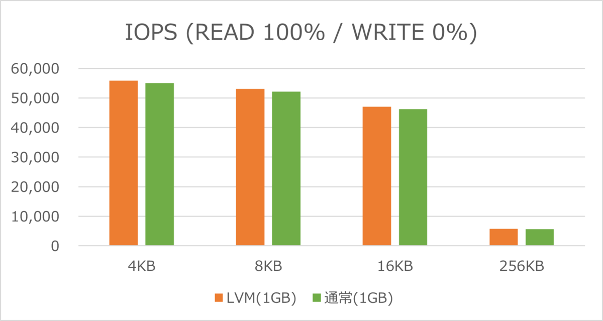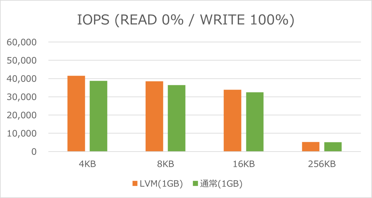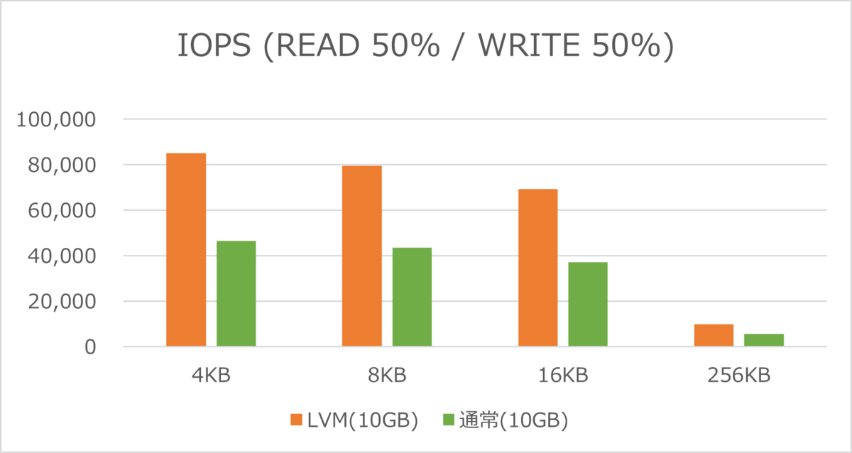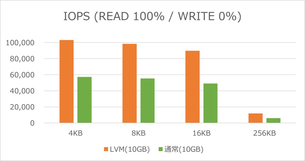 IOPSでも、LVM構成の論理ボリュームの方が数値が高い結果となりました。