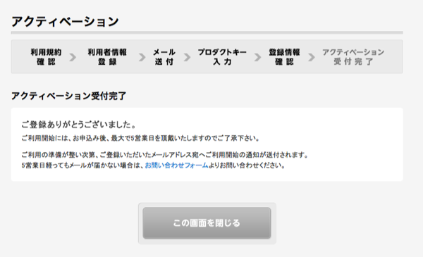 この画面が最後の完了の画面ですが、ここに書かれている通り、この後最大で5営業日待つことになります。私が行ったときは金曜日に実施し、翌月曜日には「利用開始の通知」がメールで届きました。