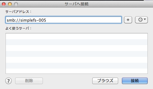 MaxOSXの場合はエクスプローラーが無いので、まずシンプルファイルサーバの機械へ接続する設定から始めます。
