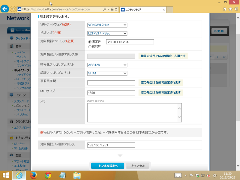 そして VPN コネクションを作成します。まずは 1 カ所目(図の右側の YAMAHA RTX1210 用) の VPN コネクションを作成します。このへんは “YAMAHA RTX1210 で単一拠点 L2TPv3/IPsec VPN(L2 VPN)” と同じです。
