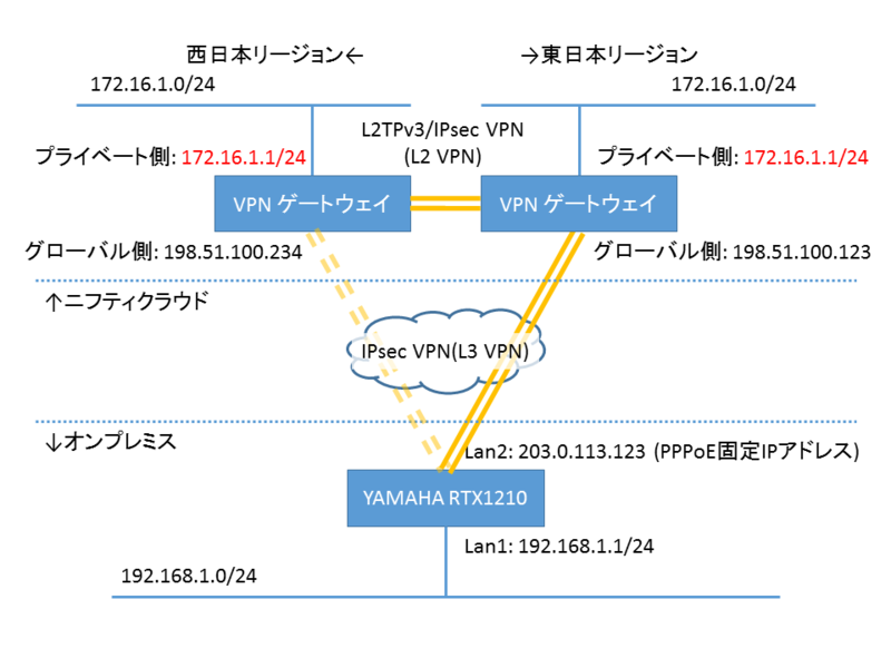 こんにちは。まほろば工房の浅間です。今回は応用編その 2 です。全 10 回におよぶ VPN ゲートウェイを使ったニフクラとオンプレ接続についての記事は、今回でいったん完了です。 前回は IPsec VPN(L3 VPN) を使って複数リージョン・複数オンプレでの VPN 構築をしてみました。 前回の構成でも東西リージョンを使った耐障害性の高いサーバ運用はできると思うのですが、東西でプライベート LAN のアドレス帯が異なる(たとえば前回の例では東日本リージョンのサーバは 172.16.1.0/24 で西日本リージョンのサーバは 172.16.2.0/24)ため、なにかあった際の切り替えは結構面倒かもしれません(たとえば社内 DNS サーバを運用されているのであれば DNS 情報を切り替えるとか?)。
