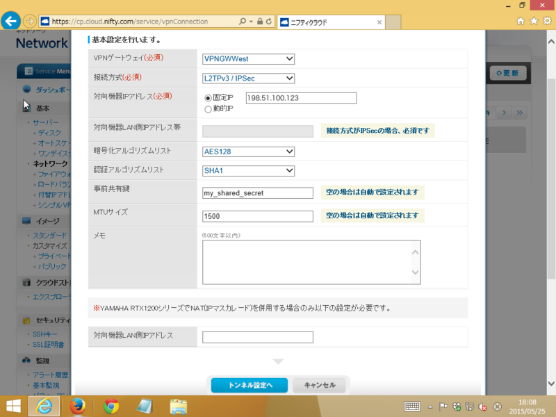 東日本リージョンの VPN ゲートウェイに YAMAHA RTX1210 との VPN コネクション(IPsec VPN) の設定をします。この作業は “YAMAHA RTX1210 で単一拠点 IPsec VPN(L3 VPN)” とほぼ一緒なので詳しくはこちらを参照してください。