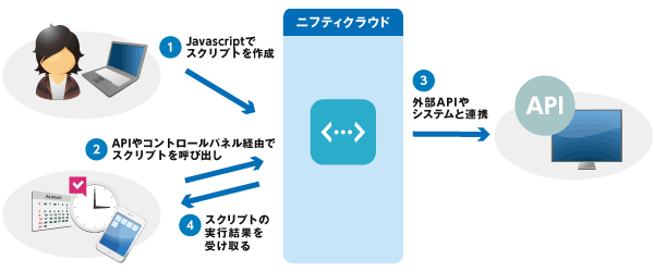 ニフティクラウド スクリプトでは、任意のnode.jsコードを保存しておき、実行させることができます。さらにニフティクラウド タイマーを組み合わせれば、その作成したスクリプトを定期的に実行させることが可能です。