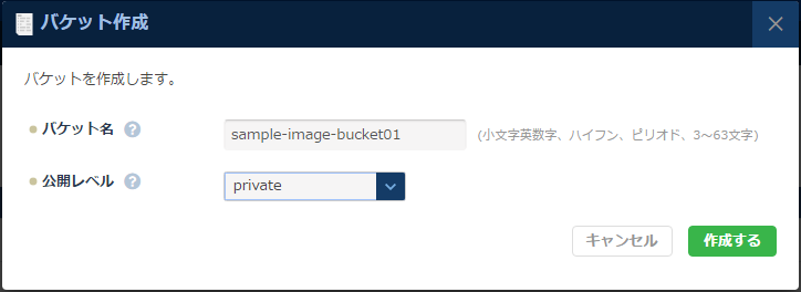 まずはコントロールパネルからバケットを作成します。公開レベルはprivateのままで大丈夫です。